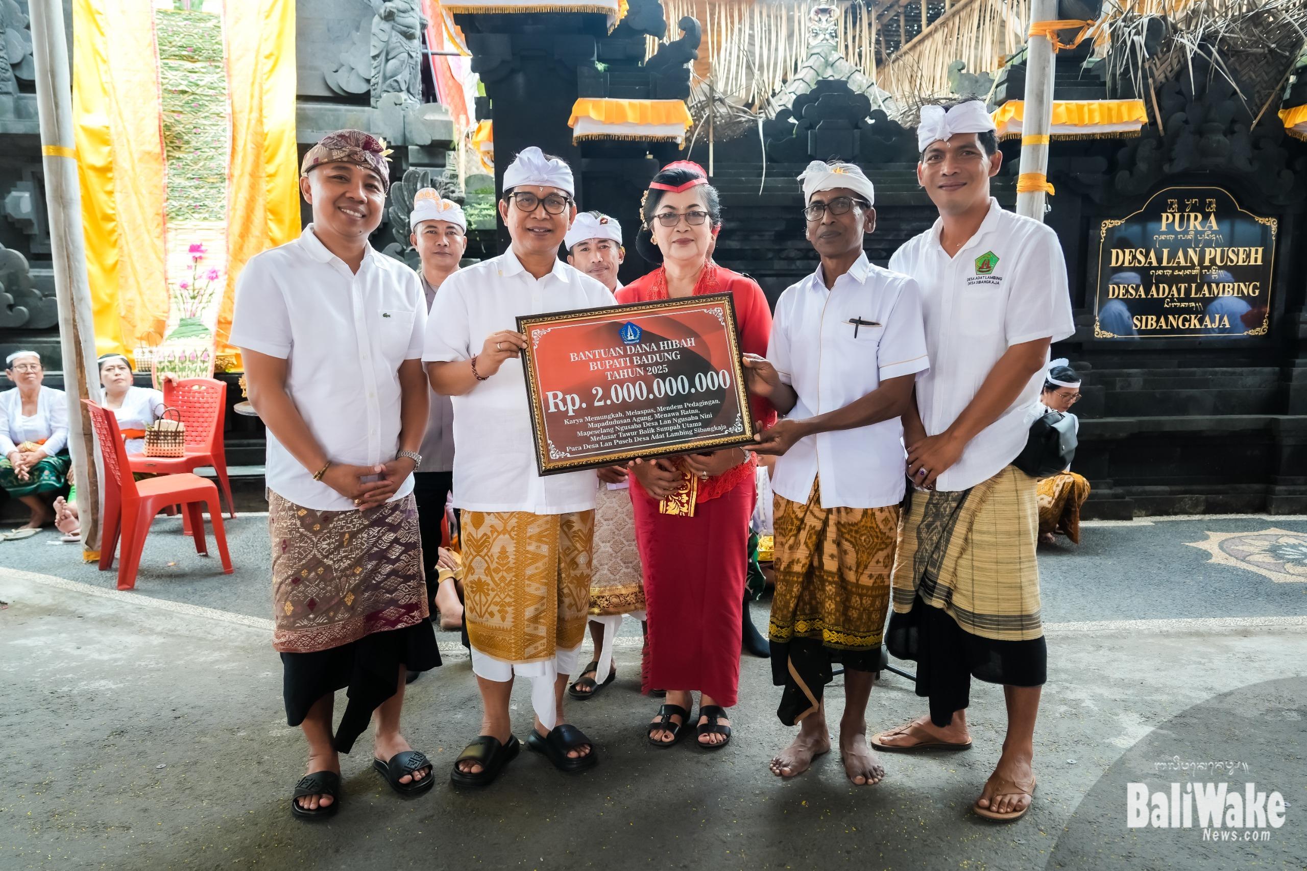 Bupati I Wayan Adi Arnawa ngupasaksi Karya mamungkah, melaspas, mendem pedagingan, pedudusan agung menawa ratna mapeselang, Ngusaba Desa dan Ngusaba Nini Medasar Tawur Balik Sumpah Utama di Pura Desa dan Pura Puseh Desa Adat Lambing, Desa Sibangkaja, Abiansemal, Jumat (11/7). Dalam kesempatan tersebut Bupati Wayan Adi Arnawa menandatangani prasasti pelaksanaan Karya Ngusaba Desa dan Ngusaba Nini yang dilanjutkan dengan penyerahan secara simbolis dana hibah yang bersumber dari APBD induk 2025 sebesar Rp. 2 miliar dan diterima panitia karya.
